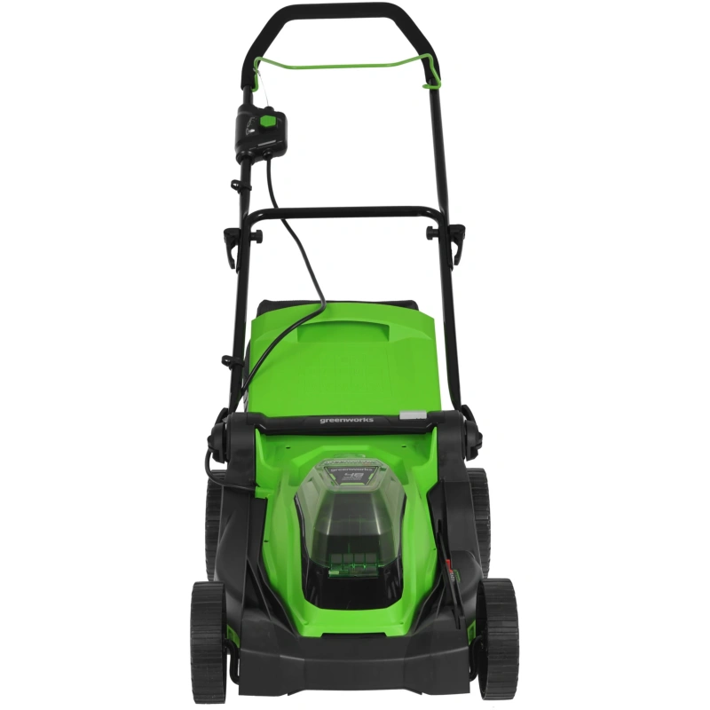 Батарееприемник помещает в себя сразу два аккумулятора. Это позволяет увеличивать продолжительность работы беспроводной газонокосилки Greenworks G24X2LM41 при полной зарядке.
