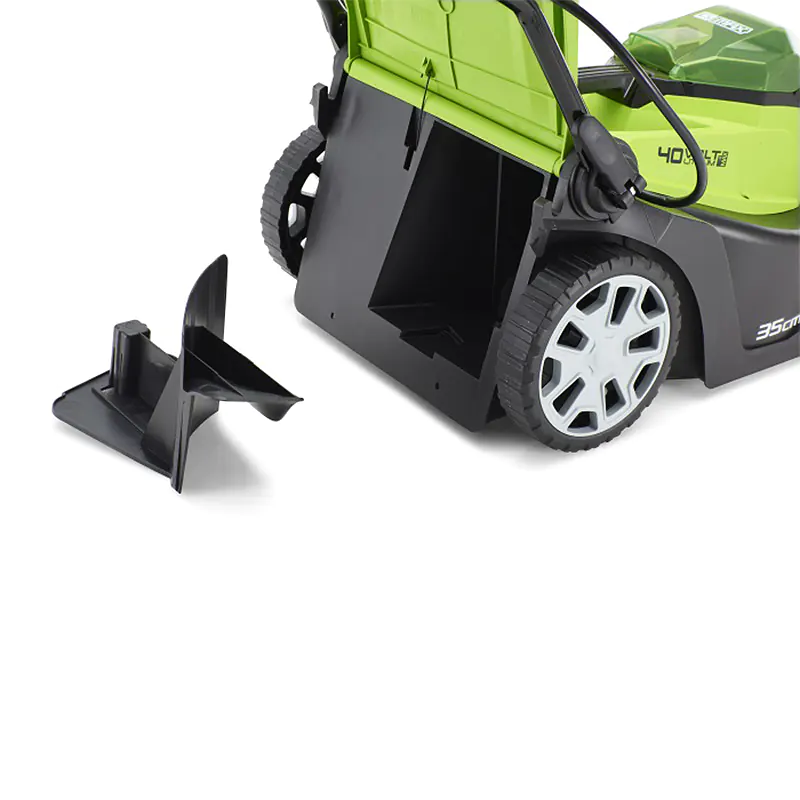 Для того, чтобы избежать случайного включения, аккумуляторная газонная косилка Greenworks G40LM35 оснащена ключом безопасности. Устройство работает только при зажимании специального рычага, который находится справой стороны рукоятки. Двигатель имеет собственную систему защиты, он не сломается, если в него попадет камень или другой твердый предмет.