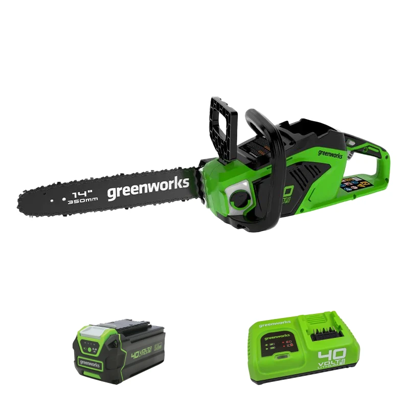 В комплект поставки также входят Аккумулятор Greenworks G40B5 (40 В, 5 Ач) и Быстрое зарядное устройство Greenworks G40UC5 (40 В, 5 А)