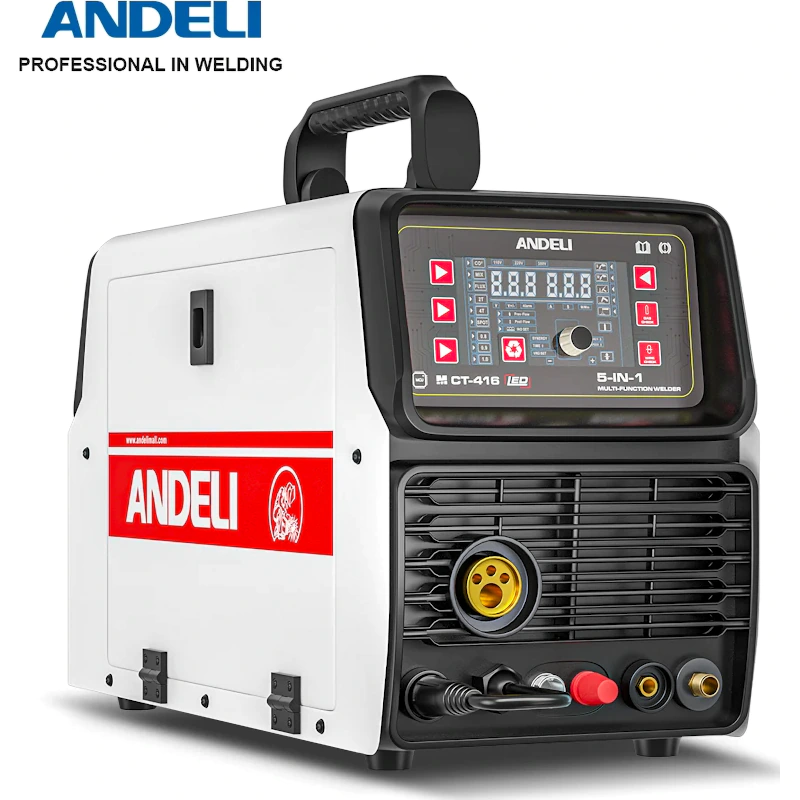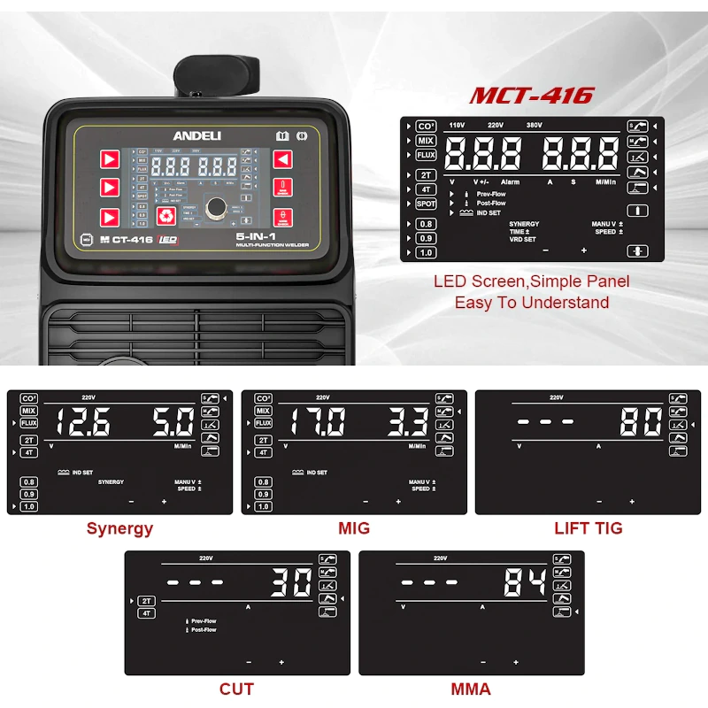 Сварочный полуавтомат Andeli MCT-416 – это универсальное и многофункциональное устройство 5 в 1, которое сочетает в себе возможности для сварки MIG (с газом и без газа), MMA, TIG, воздушно-плазменной резки СUT и синергетический режим. Аппарат предназначен для работы с различными металлами, включая сталь, алюминий и медь, подходит для ремонта автомобилей, монтажа конструкций, домашнего хозяйства и небольших производств. С управлением разберется даже начинающий сварщик, а возможность регулировки настроек по нескольким параметрам делает инвертор надежным помощником профессионального мастера.
