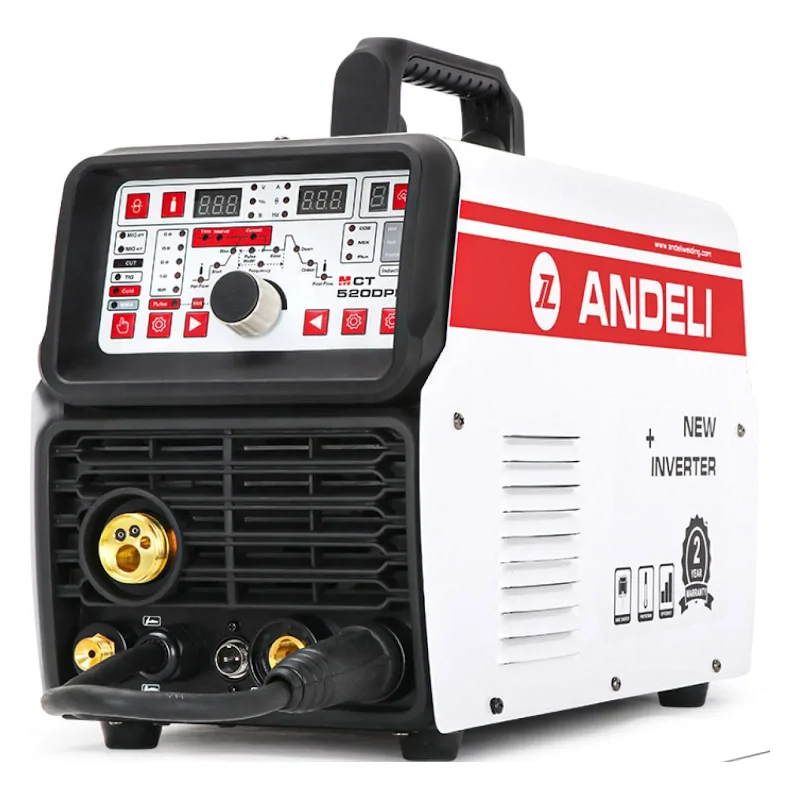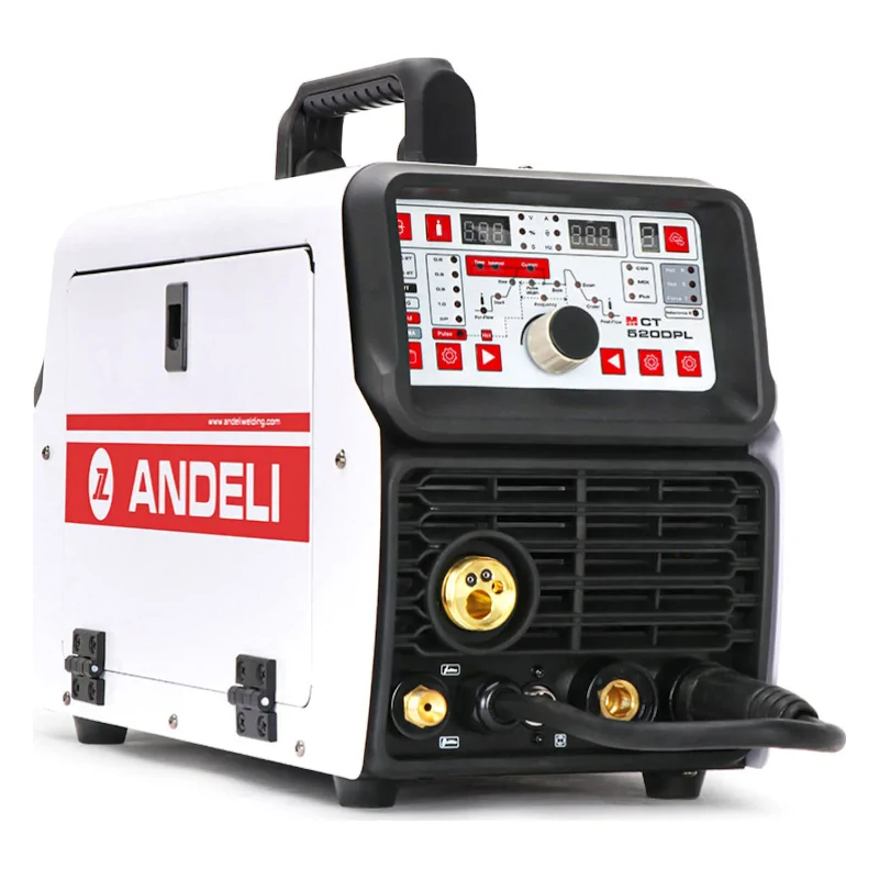 Сварочный инвертор Andeli MCT-520DPL – универсальный аппарат для пяти видов сварки: ручной электродуговой покрытым электродом ММА, плавящимся электродом в среде инертного газа MIG, аргонодуговой вольфрамовым электродом TIG, воздушно-плазменной резки металла СUT и холодной сварки Cold. Многофункциональная модель подходит для сварки и резки низколегированной и высоколегированной, углеродистой, нержавеющей стали, чугуна, цветных металлов и сплавов, поэтому пригодится в мастерской, автосервисе, на производстве и строительстве.
