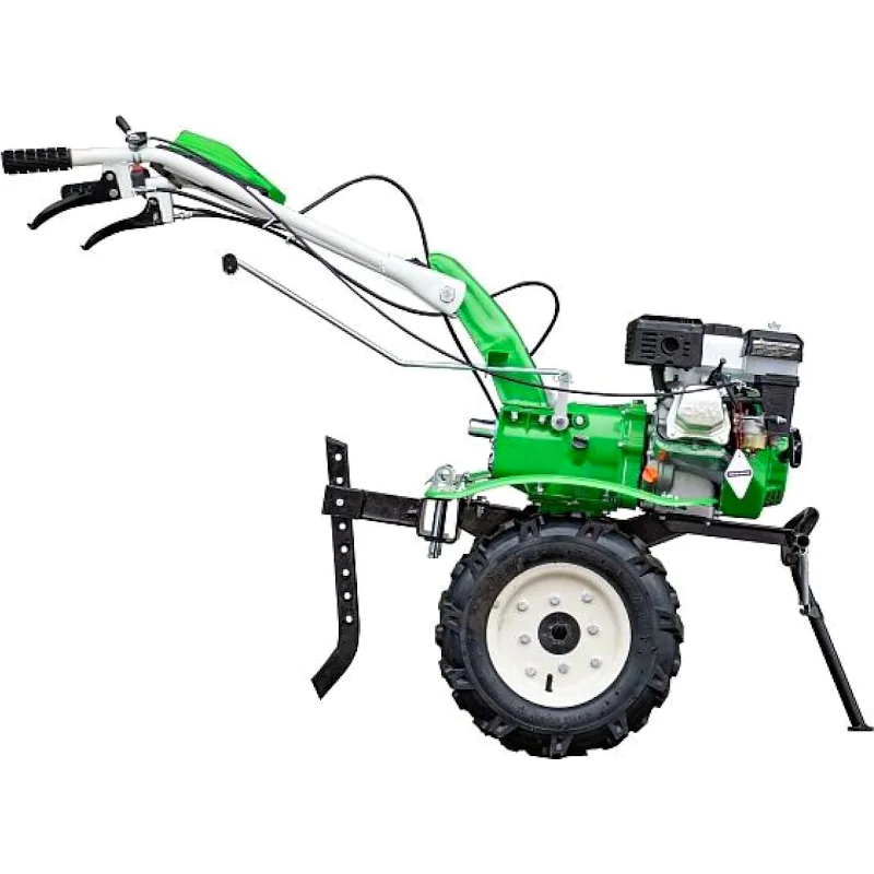 На шестигранные оси диаметром 23 мм можно установить колеса с глубоким протектором, фрезы или грунтозацепы. С помощью соответствующего навесного оборудования бензиновый мотоблок вспашет землю, сформирует грядки, окучит или выкопает картофель и другие корнеплоды, скосит траву, поможет перевезти грузы.