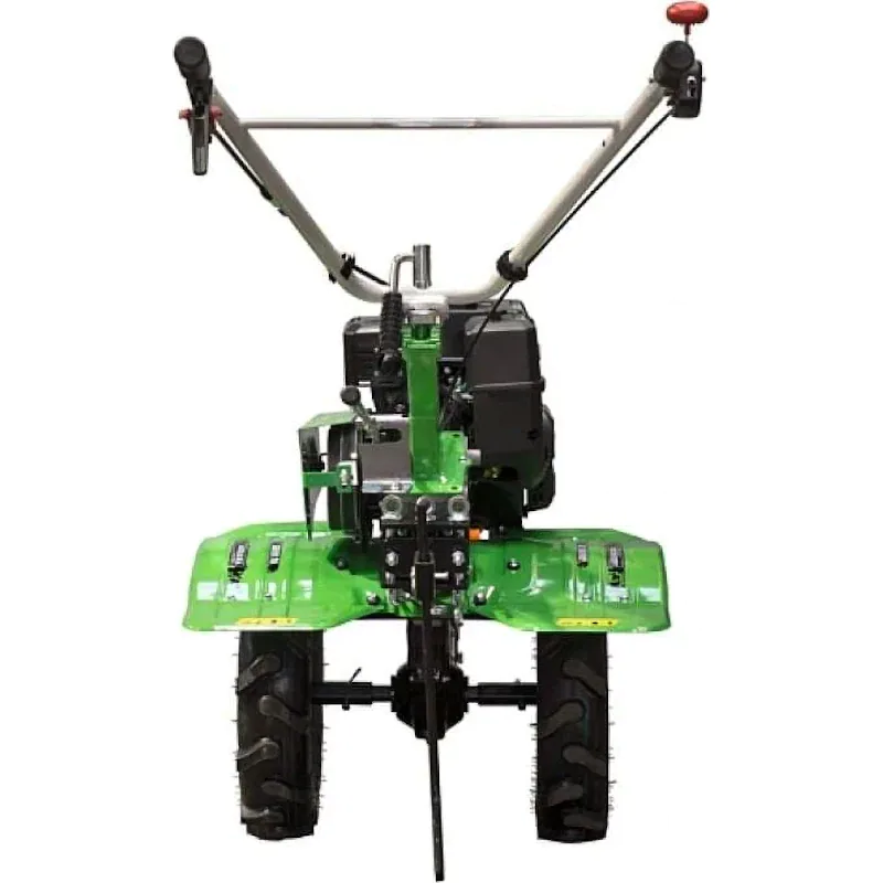 Четырехтактный двигатель заводится при помощи ручного стартера. Элементы управления удобно расположены под руками. Опуская ручки вниз, вы уменьшаете глубину вспашки и увеличиваете скорость движения бензинового мотоблока. Поднимая ручки выше, вы снижаете скорость машины. В экстренном случае двигатель легко заглушить, нажав кнопку переключателя.