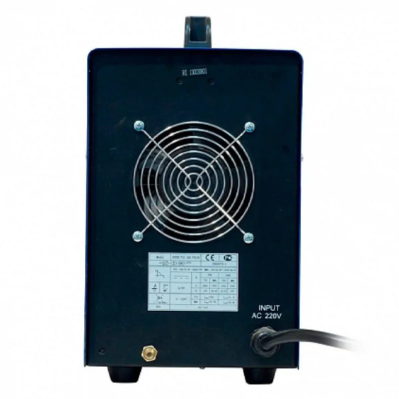 Цифровой дисплей с яркой индикацией отображает текущее значение тока. Рядом установлены три переключателя, с их помощью вы можете задать характеристики пульса, переключиться между способами сварки TIG и MMA, или выбрать 2Т/4Т работу горелки. Ниже размещены клеммы для подключения электродов и кабеля массы.
