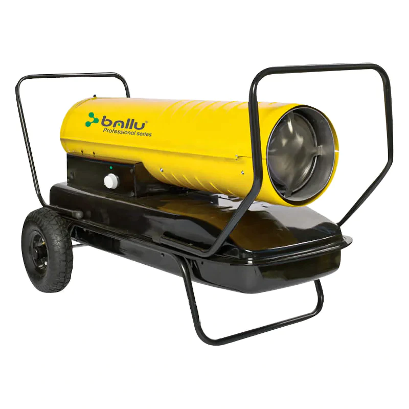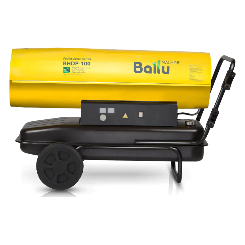 Дизельная тепловая пушка Ballu BHDP-100 обладает мощностью 100 кВт и применяется для помещений площадью до 1000 м². Для комфортного использования данная модель оснащена резиновыми колесами и ручкой, термостатом, а также системой контроля горения пламени.