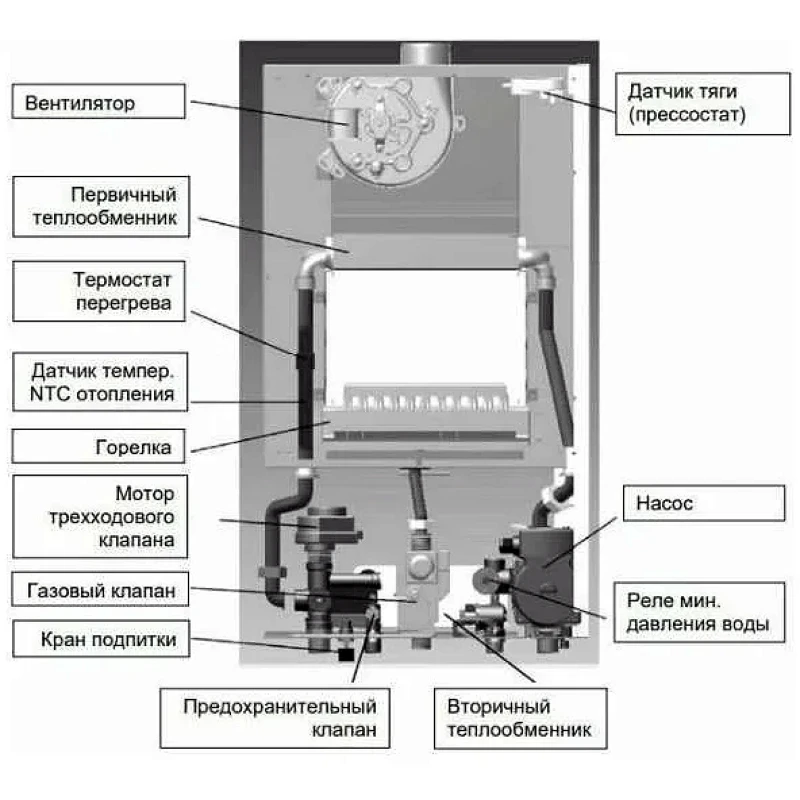 - Контроль наличия тяги и пламени в горелке.