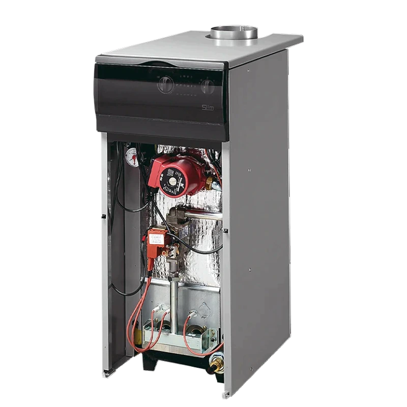 Газовый конвекционный напольный котел Baxi SLIM 1.230 iN мощностью 22 кВт с открытой камерой сгорания. (Котел с открытой камерой забирает воздух для горения из комнаты и выводит отработанный газ через дымоход. Для устройства с закрытой камерой нужен коаксиальный дымоход. Он устроен по принципу «труба в трубе», когда по одной заходит воздух для поддержания пламени, по другой — выводятся продукты сгорания)
