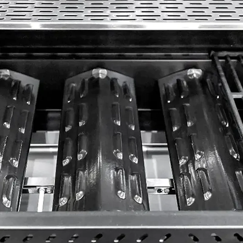 У газового гриля VILLA 400 Black на борту 4 основные горелки, оснащенные V-образными рассекателями пламени. Рассекатели обеспечивают равномерное слоистое нагревание, а капающие на них капли маринада или сока испаряются под воздействием высокой температуры и поднимаются вверх, делая вкус ваших блюд более интенсивным.