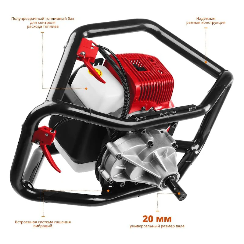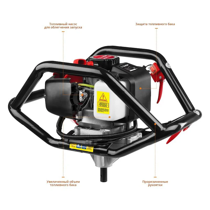 Бензобур, благодаря своей мощности, развивает скорость вращения до 8800 об/мин. Это позволяет оборудованию без труда справляться с мягкими, твердыми, мерзлыми грунтами, а также со льдом при установке ограждений.