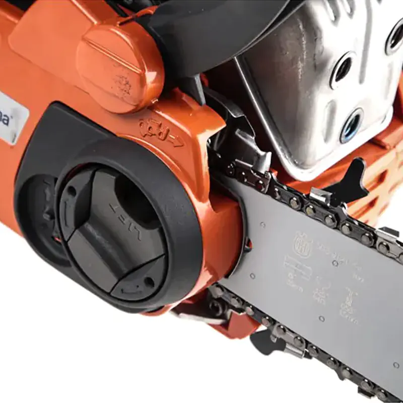 Бензиновая пила Husqvarna 455e Rancher AT II оснащена инерционным тормозом, который убережет вас от травм в случае резкого отскока цепи. Пластиковая преграда, находящаяся в передней части корпуса, также защитит вас от щепок во время работы.