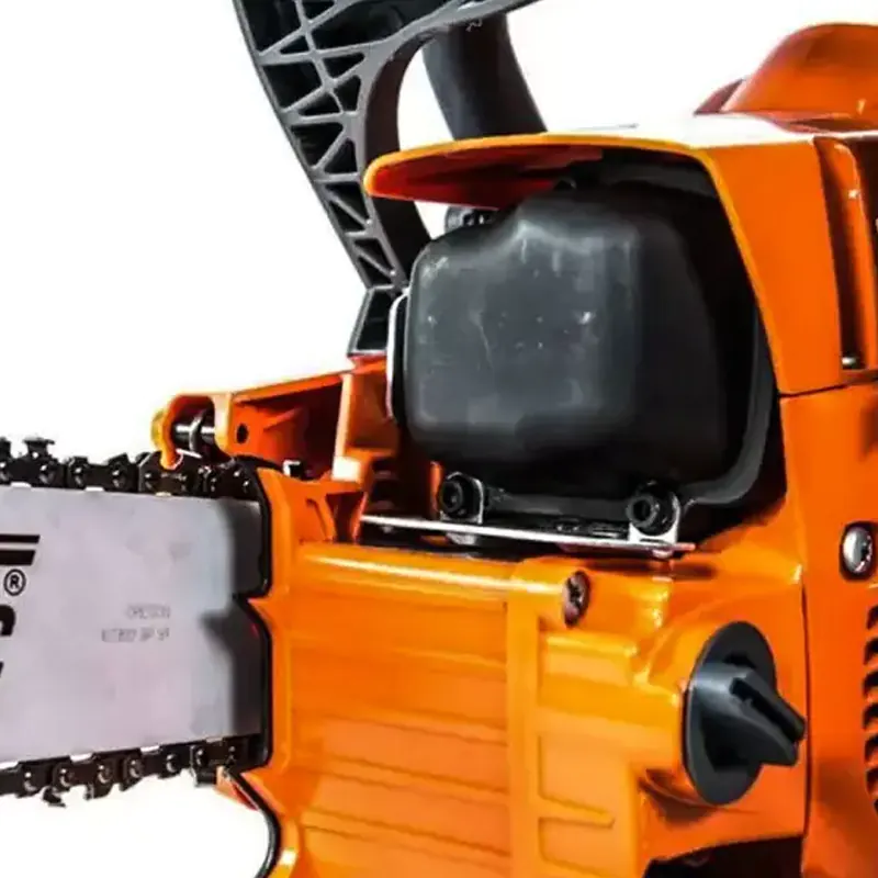 - Многофункциональный рычаг управления. Встроенные в рычаг органы управления включением/выключение зажигания, воздушной заслонкой и «полугазом» упрощают эксплуатацию пилы.