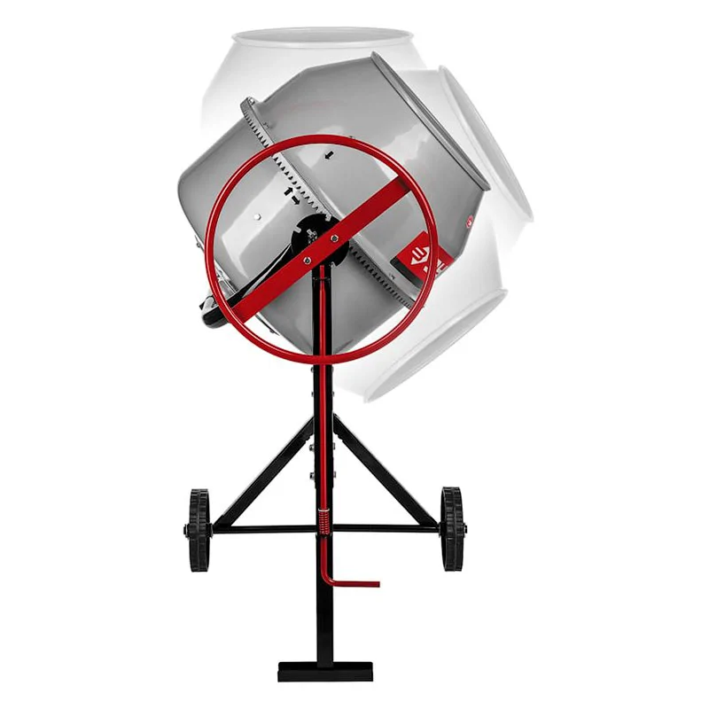Благодаря бетономешалке приготовление 90 литров смеси занимает от 2 до 5 минут. Для удобства перемешивания и выгрузки угол наклона барабана можно регулировать с помощью поворотного колеса. Ножной фиксатор позволяет установить емкость в одном из семи возможных положений. Плавный пуск двигателя обеспечивает минимальные вибрации и отсутствие рывков при включении и выключении. Большие колеса диаметром 200 мм облегчают перемещение устройства по участку.