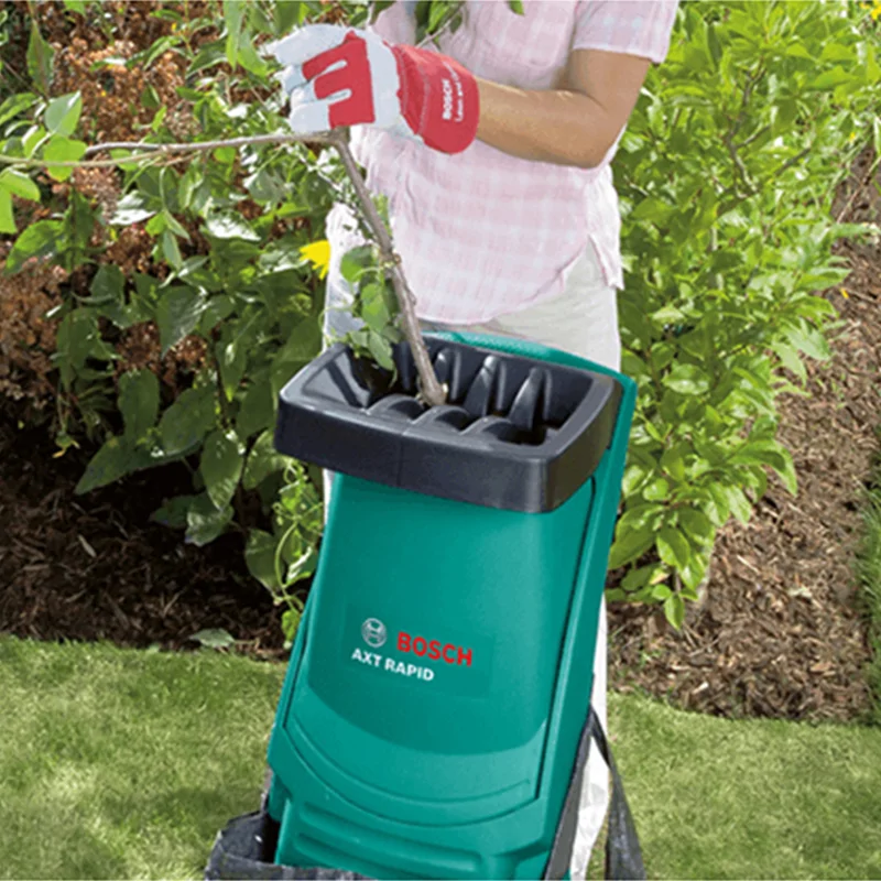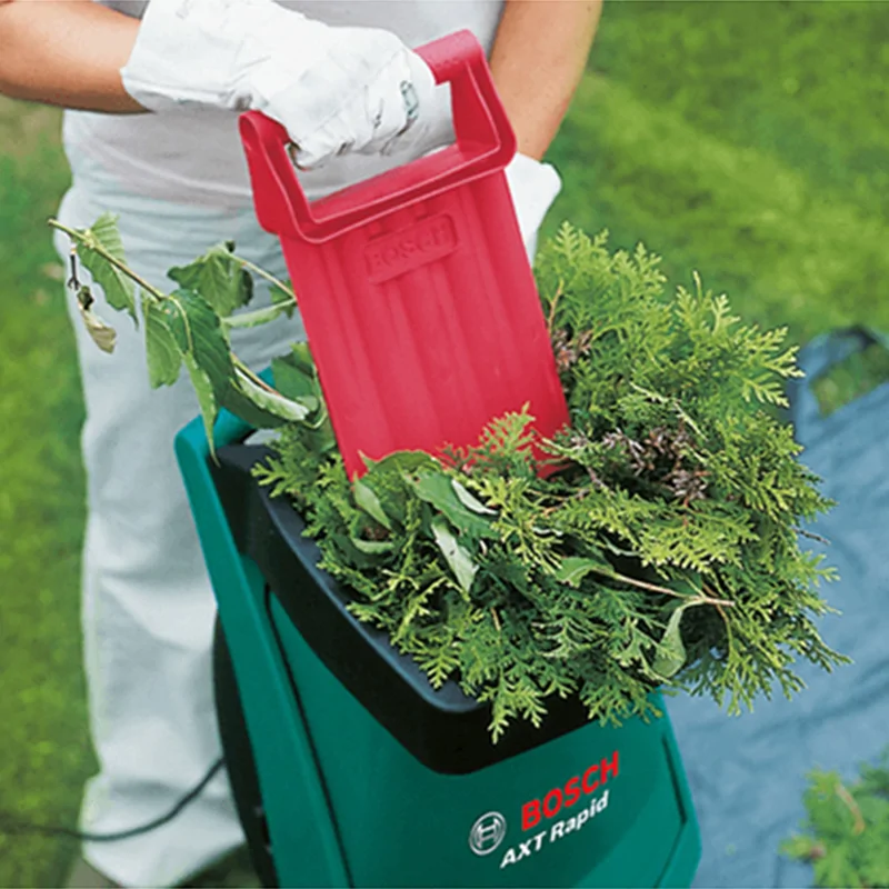 Садовый измельчитель Bosch AXT Rapid 2000 работает от бытовой электрической сети напряжением 230 В, используется для измельчения зеленых садовых отходов с листьями, таких как ветви деревьев и обрезки кустарников толщиной до 35 мм. Устройство уменьшает объем растительного мусора, помогает упростить его утилизацию, приготовить мульчу или компост.