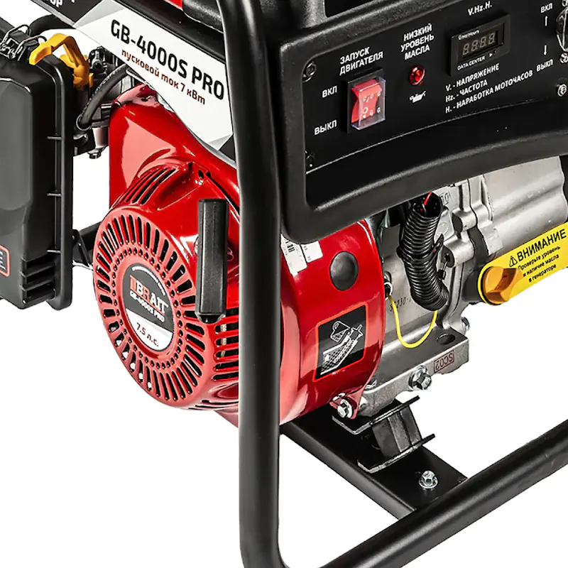 Сравнительно невысокий уровень шума 84 дБ позволят находиться в одном помещении с генератором BRAIT GB-7500E PRO, не испытывая дискомфорта. Открытый тип корпуса обеспечивает быстрый доступ ко всем основным узлам. Это упрощает обслуживание и выполнение ремонтных работ. В качестве каркаса используется металлическая рама. Она защищает внутренние элементы от повреждений при транспортировке, а также образует рукоятки по бокам и устойчивое основание снизу.