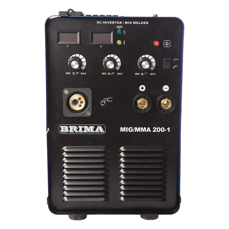 На лицевой панели сварочного аппарата BRIMA MIG/MMA-200-1 расположено два цифровых дисплея. Один отображает сварочный ток, а другой напряжение. За счет этого удобно отслеживать параметры во время ручной регулировки.