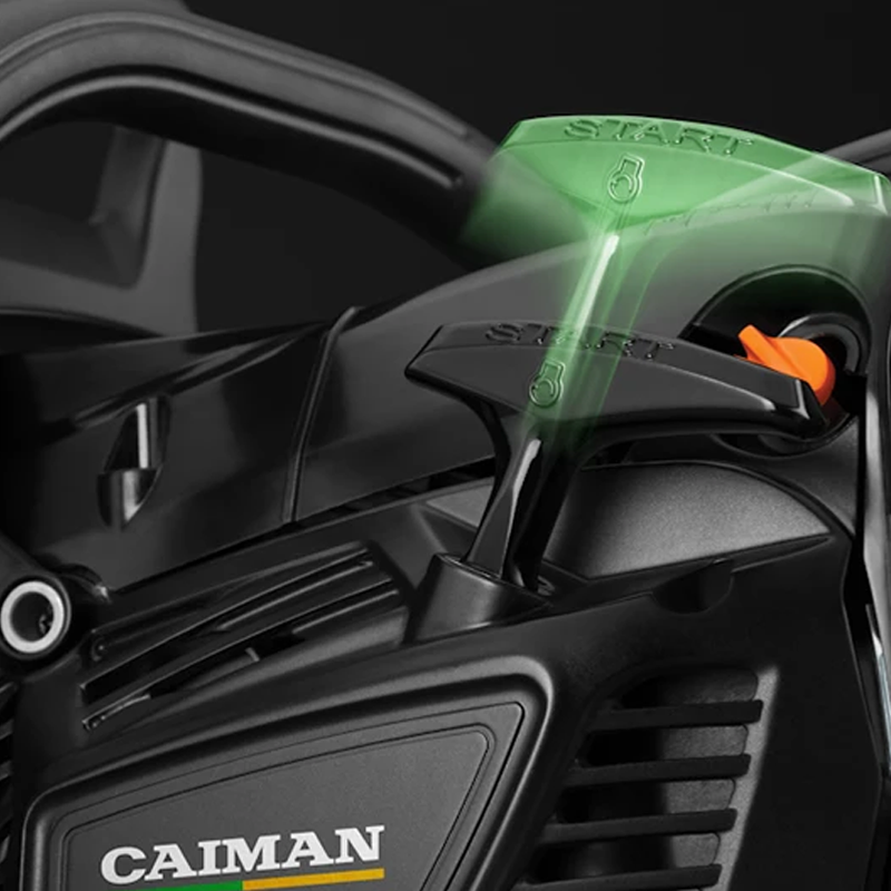 В отличие от обычных бензопил с рабочим объемом до 60 см³ модели CAIMAN Chenso оснащены декомпрессионным клапаном для легкого запуска. При старте двигателя клапан выпускает часть сжатой топливной смеси из цилиндра. Вследствие этого заметно снижается требуемое усилие на шнуре стартера во время запуска бензопилы