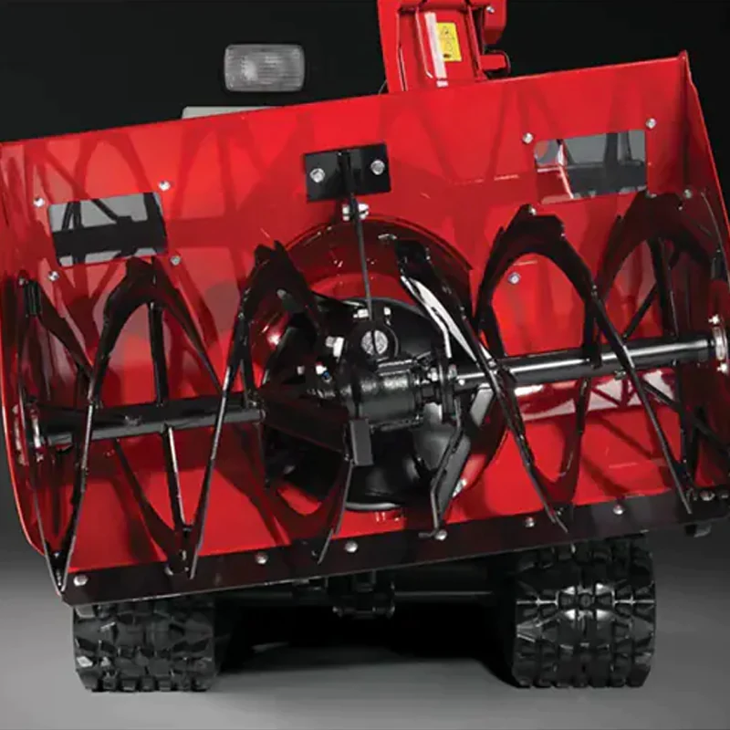 - 2 ступень – мощная крыльчатка с лопастями, усиленными металлическими пластинами. При максимальной скорости вращения она способна отбрасывать снег на расстояние до 22 метров.