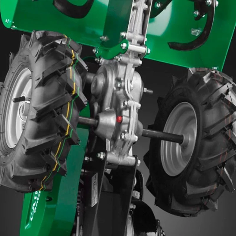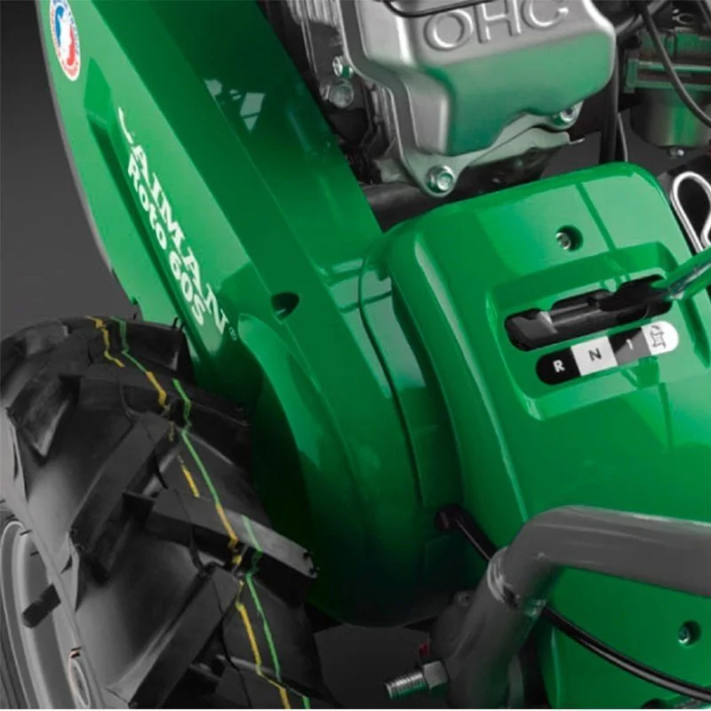 Бензиновый культиватор Caiman ROTO 60S справляется со вспашкой и рыхлением почвы любого типа, включая целинные земли. Ширина обработки составляет 480 мм, максимальная глубина — 20 см. Главная особенность модели — наличие больших пневматических колес и переключателя скоростей. Благодаря этому самоходная машина движется по грунту и тянет за собой фрезу. Бензиновый четырехтактный двигатель Subaru мощностью 5,7 л.с. легко заводится ручным стартером благодаря системе механической декомпрессии.