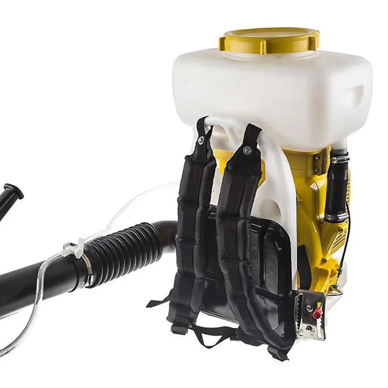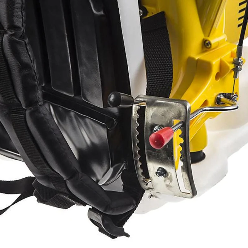 Бензиновый распылитель снабжен баком с широкой горловиной для удобства заполнения жидкостью или сыпучими веществами. После подготовки к работе распылитель легко надеть на плечи за счет ранцевой оснастки. Ремешки равномерно распределяют вес инструмента на спину, облегчая перемещение по участку. Их длина настраивается вручную. Для большего удобства вы можете отрегулировать и положение рукоятки, расположенной на напорной трубе.
