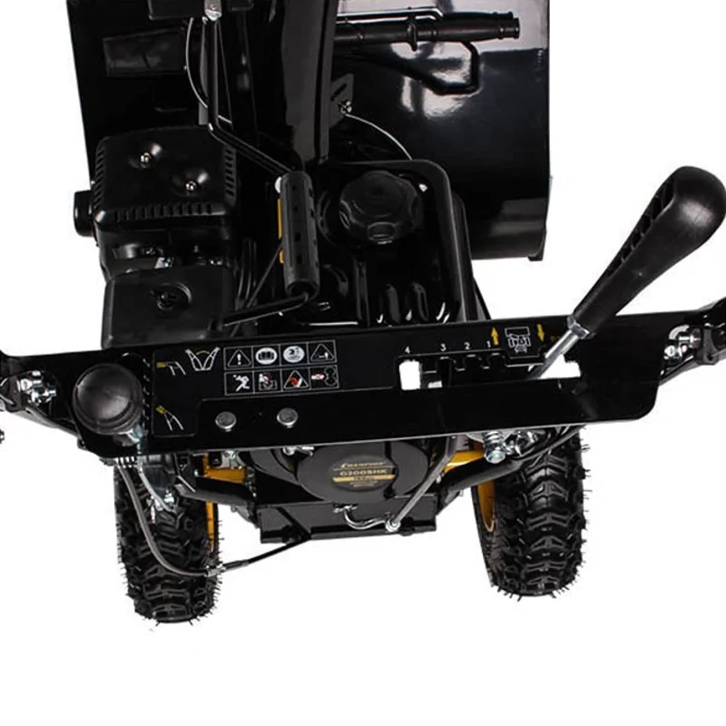 Бензиновый снегоуборщик CHAMPION ST661 с шириной захвата 61 см оборудован самоходным приводом, который включает в себя 4 скорости вперед и 1 назад. Направление выпускного желоба и наклон дефлектора регулируются с помощью рукояток на панели управления.