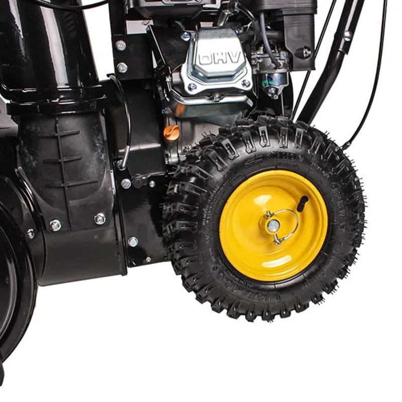 Широкие колеса диаметром 13" обеспечивают хорошую проходимость по неровным участкам. Шины с глубоким протектором позволяют перемещать машину по глубокому рыхлому снегу или гололедице. Задняя передача помогает без усилий вывести инструмент из сугроба.
