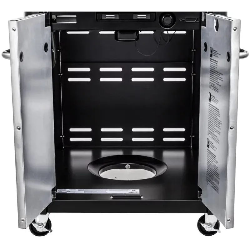 Увеличить площадь рабочей поверхности либо занять компактное место для хранения позволит раскладной боковой столик с левой стороны гриля. Разместить газовый баллон, а также все необходимые принадлежности помогут удобные отсеки хранения. Для более комфортного приготовления в тёмное время суток на ручках управления горелками установлена подсветка.