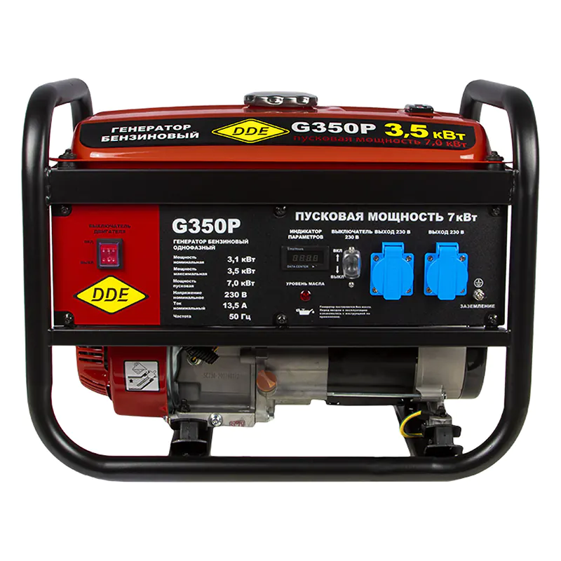 В бензогенераторе DDE G350P используется медная обмотка альтернатора. Такой материал долговечнее и проводит ток лучше алюминия, а также не сильно нагревается. Металлическая труба, огибающая весь корпус, образует прочную защитную раму. Это бережет технику от механических повреждений при перевозке или во время работы на строительной площадке.