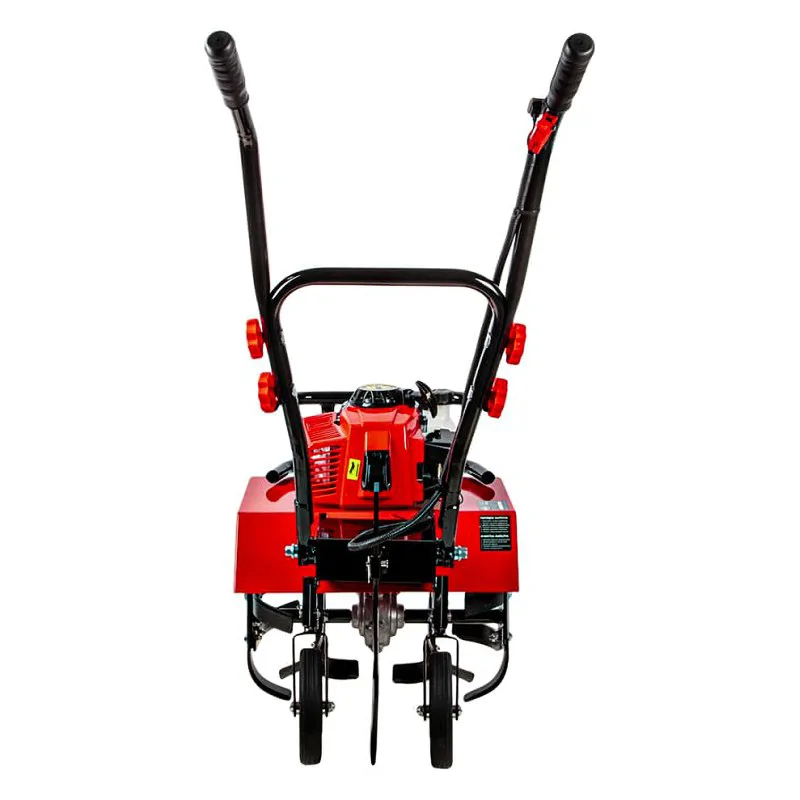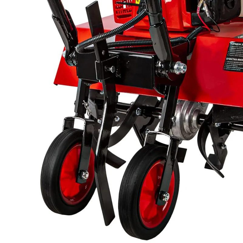 Фрезы расположены под защитным крылом. Козырек предотвращает вылет земли и растительного мусора в разные стороны. Для удобства все основные элементы управления расположены прямо на ручках в зоне быстрого доступа. Переставляя сошник, расположенный в задней части бензинового культиватора, вы можете задавать глубину рыхления почвы.
