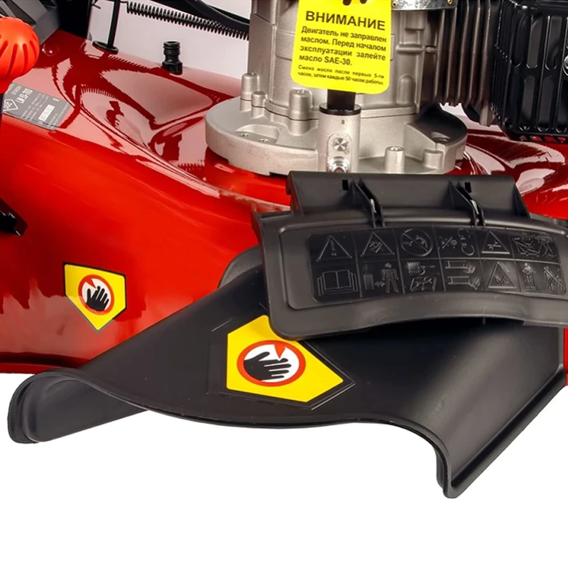 Бензиновая газонокосилка легко заводится благодаря электростартеру. Устройство поддерживает четыре режима стрижки: со сбором в контейнер, мульчированием, выбросом вниз или вправо. Первый вариант подойдет для получения чистого и аккуратного газона. Во втором случае скошенная растительность мелко измельчается и возвращается на участок для удобрения почвы. Третий и четвертый режимы удобны для скашивания высокой и влажной травы, обработке больших участков. Управление осуществляется с помощью двух рычагов на рукоятке, запускающих вращение ножа и привод на колеса. Газонокосилка движется самостоятельно; требуется только слегка ее направлять.