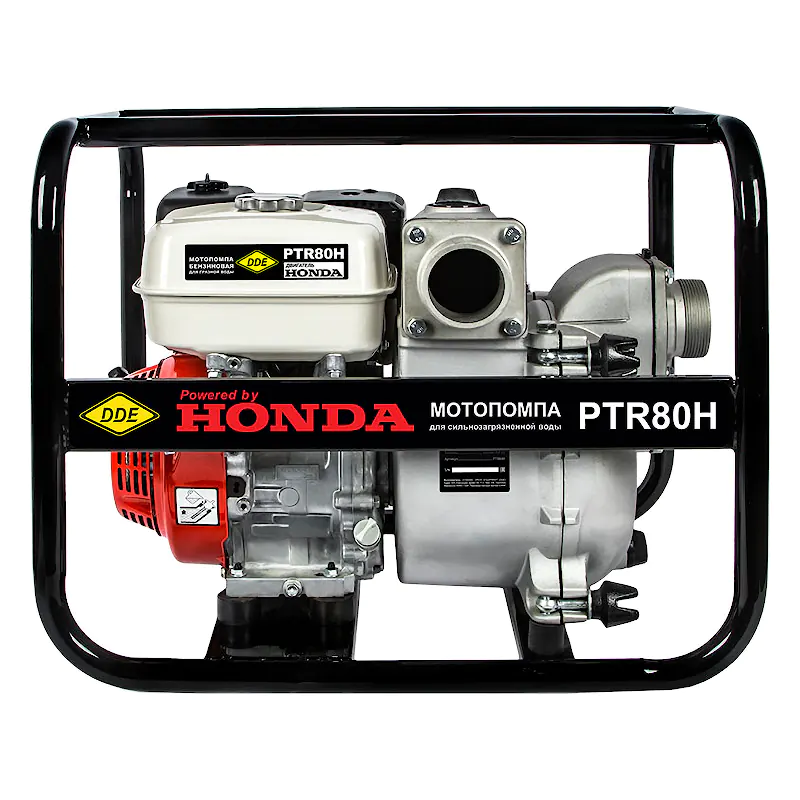 Бензиновая грязевая мотопомпа DDE PTR80H обладает производительностью 1200 л/мин и позволяет работать с водой, где допустимый диаметр частиц не превышает 28 мм. Высота всасывания составляет 8 м, а напор — 27 м.