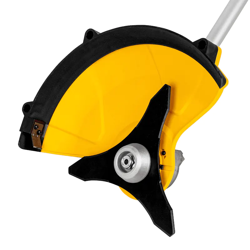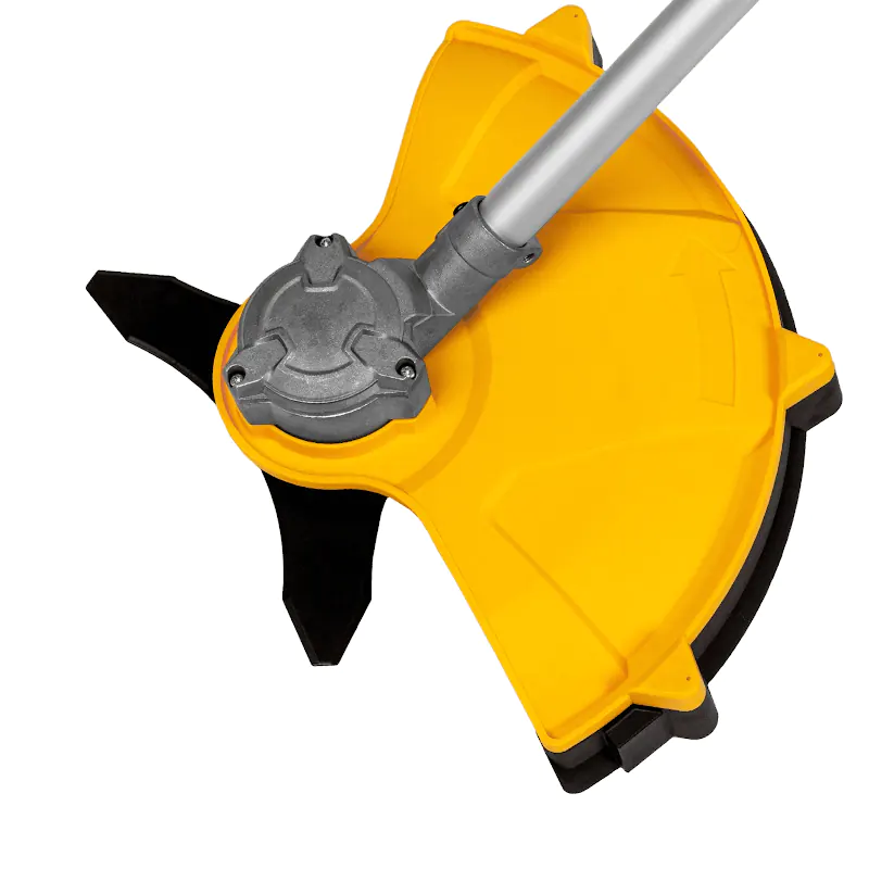 Инструмент не требует длительной подготовки к работе. Установите заряженные аккумуляторы и нажмите кнопку запуска. Двигатель плавно набирает обороты, без стартовых рывков. Конструкция аккумуляторного триммера DENZEL с прямой штангой и велосипедной рукояткой позволяет совершать размашистые движения по дуге как при работе обычной косой, что значительно повышает производительность работ. Функция реверса двигателя запускает вращение оснастки в обратную сторону и автоматически выключается через 2 секунды. Это действие позволяет избавиться от травы, намотанной на вал.