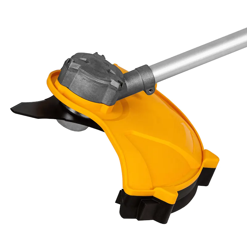 Малый вес и удобная форма рукояток обеспечивают комфортные условия работы с инструментом. Большой кожух защищает от разлетающейся травы. Входящий в комплект поставки наплечный ремень снимает нагрузку с рук.