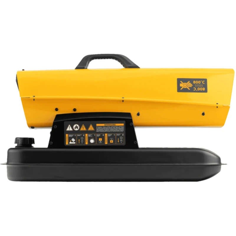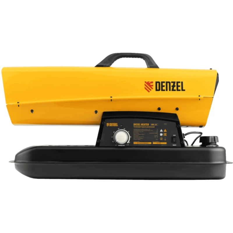 Дизельная тепловая пушка Denzel DHG-25i 96483 номинальной тепловой мощностью 25 кВт и производительностью 600 куб. м/ч, с прямым типом нагрева, с электронным термостатом, предназначена для обогрева цехов, складов, теплиц и других нежилых помещений. Используется в строительстве и на производстве. Пушка характеризуется низким расходом топлива: полного бака хватает на 10 часов работы. Важно: в обогреваемом помещении необходимо обеспечить хорошую вентиляцию.