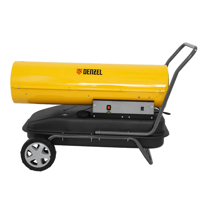 Дизельная тепловая пушка Denzel DHG-50 – самая мощная модель в линейке, которая предназначена для размещения в больших помещениях площадью до 500 м². Например, в ангаре, цехе или на складе. Для простого перемещения модель оснащена тележкой с высокой рукояткой и транспортировочными колесами.