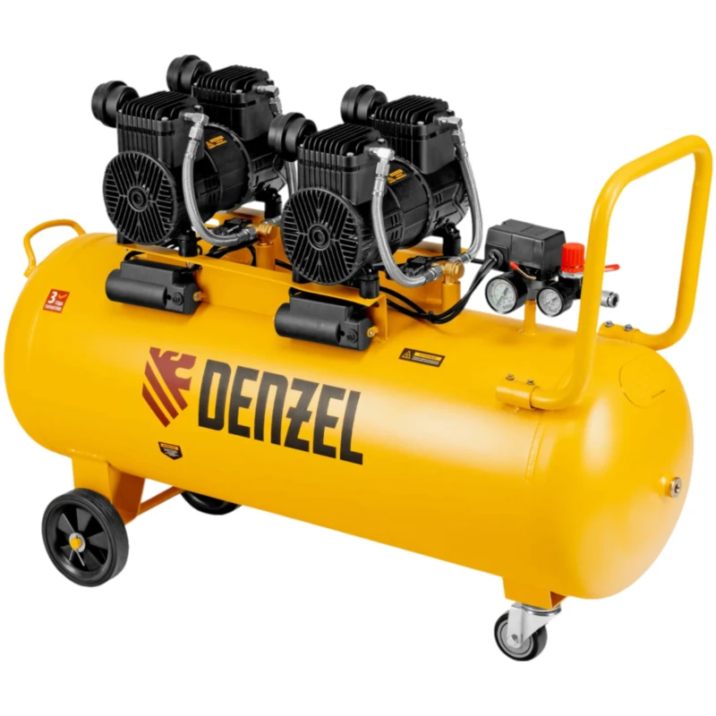 Безмасляный малошумный компрессор Denzel DLP-3000/100 58145 мощностью 3 кВт (2 x 1,5 кВт) и производительностью 500 л/мин, с ресивером объемом 100 л, оснащен двигателем со скоростью вращения 2850 об/мин. Предназначен для обеспечения пневмоинструмента сжатым воздухом. Для работы компрессора не требуется масло, поэтому он подходит для проведения покрасочных работ и продувки электронных компонентов. Прямой привод обеспечивает максимально эффективную работу и высокую производительность. Благодаря низкому уровню шума эксплуатация компрессора не вызывает ощущение дискомфорта.