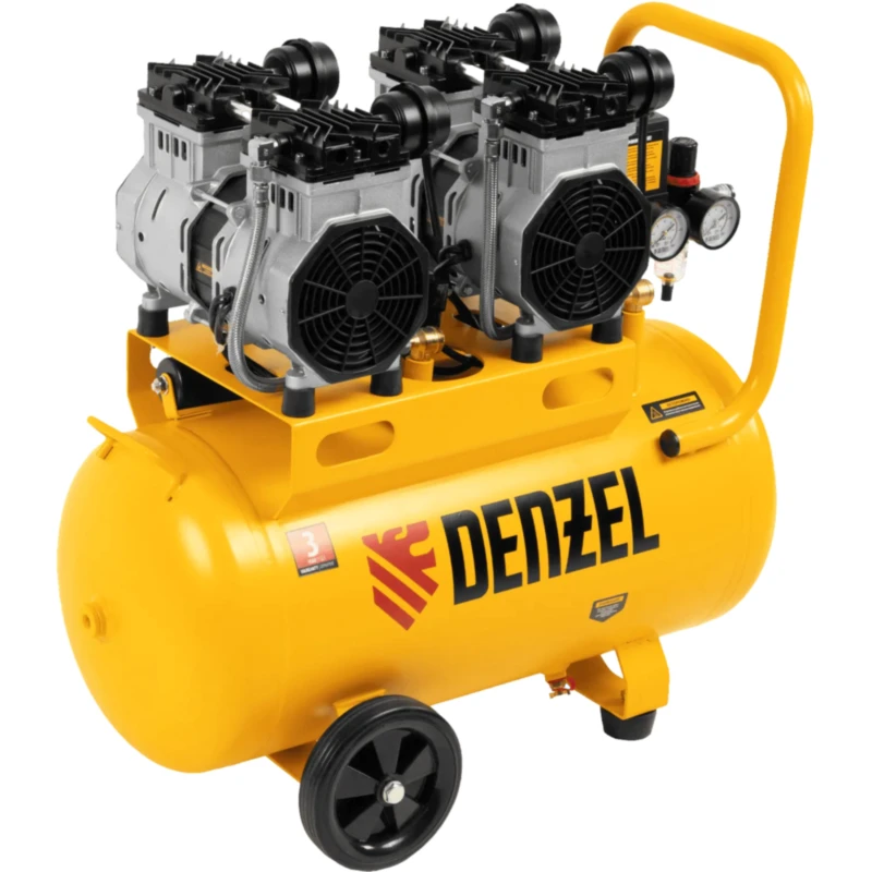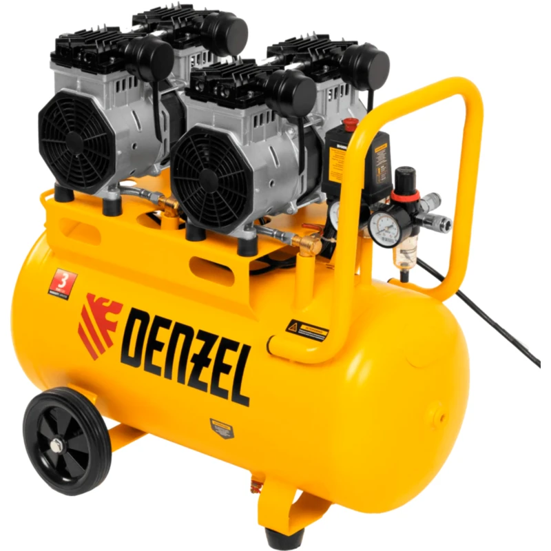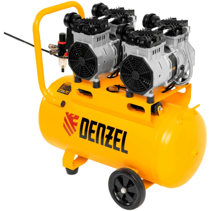 Безмасляный малошумный компрессор Denzel DLS 2200/50 58031 мощностью 2200 (2 х 1100) Вт, объемом ресивера 50 л и производительностью 380 л/мин предназначен для обеспечения пневмоинструмента сжатым воздухом, подаваемым под давлением до 8 бар. Частота вращения вала составляет 2800 об/мин, что позволило добиться увеличения производительности более чем на 40%. Компрессор позволяет подключить пневматический заклепочник, дрель, шлифмашину и т.д. Оптимален для работы с краскопультом и для продувки электронных компонентов, т. к. в сжатом воздухе отсутствуют частицы масла. Компрессор пригодится в мастерской, гараже, на строительной площадке.