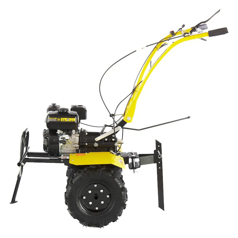 На регулируемой по высоте рулевой рукоятке бензинового мотоблока находятся основные элементы управления: регулятор оборотов двигателя, сцепление и реверс. Выключатель зажигания удобно расположен под правой рукой, что позволяет мгновенно заглушить двигатель в экстренной ситуации. Культивирование целины и тяжелых глинистых почв рекомендуется на первой скорости; рыхлой и ранее вспаханной земли — на второй. Задний ход облегчает маневрирование и вытаскивание застрявшей в земле машины. Глубина вспашки регулируется установкой высоты сошника.