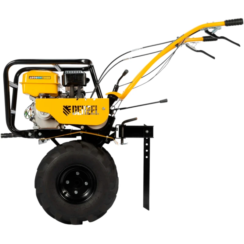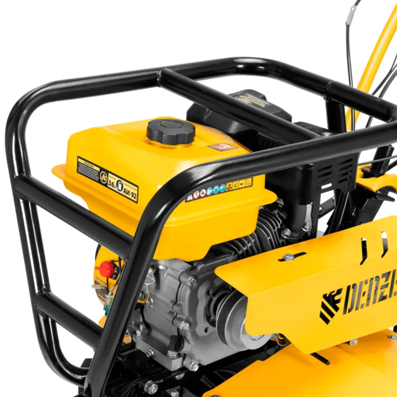 Мотоблок Denzel DPT-470S-PRO 56445 с ременным сцеплением, двигателем объемом 212 см3 и мощностью 7 л.с., с коробкой передач 4 вперед/2 назад и шкивом отбора мощности, комплектуется 24 фрезами (3х4). Предназначен для выполнения земляных работ: прополки, вспахивания, боронования грунта, перевозки грузов и т.д.