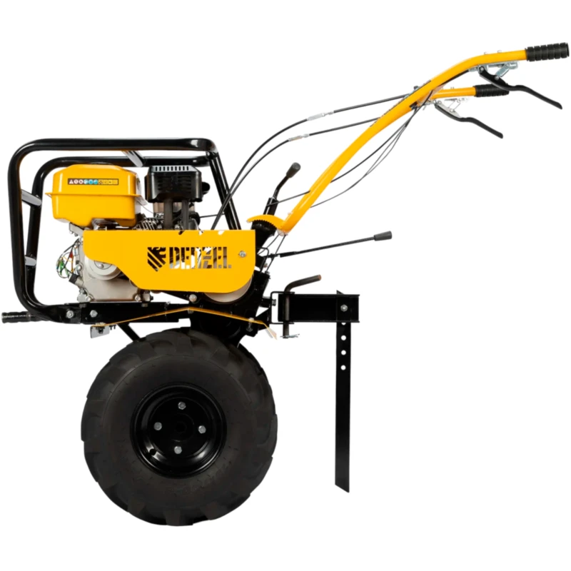 - Возможность использования в качестве транспортного средства — установив прицеп Denzel 59950, можно перемещаться по территории, а также перевозить грузы.