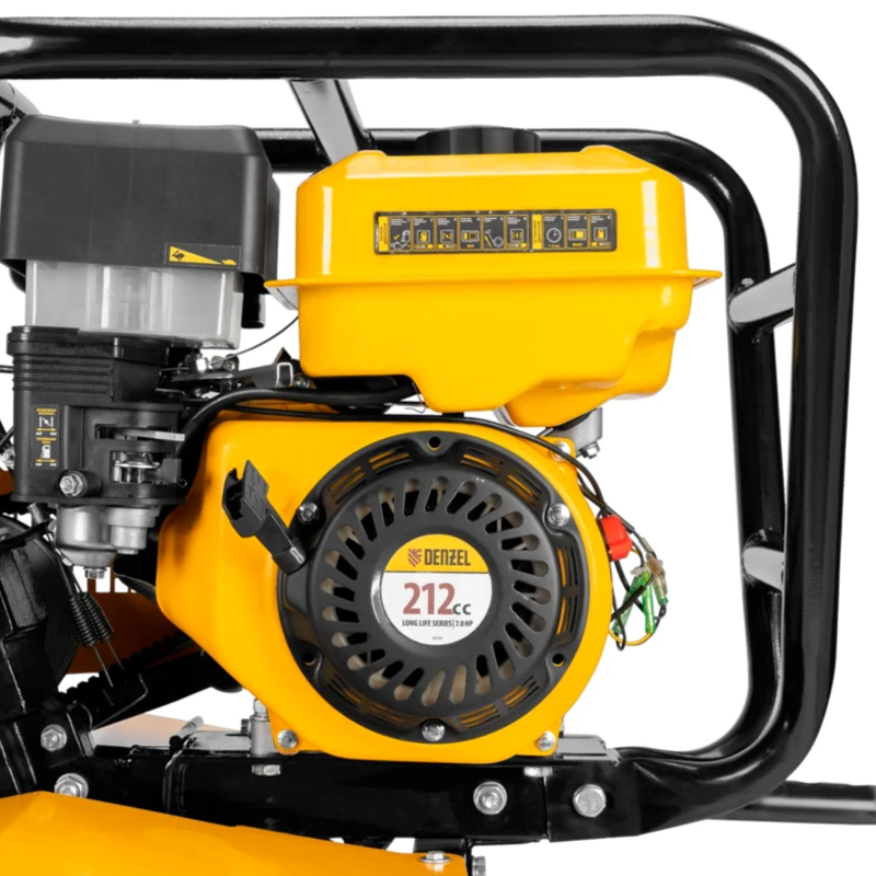 Мотоблок Denzel DPT-670S-PRO 56446 с ременным сцеплением, двигателем объемом 212 см3 и мощностью 7 л.с., с коробкой передач 6 вперед/2 назад и шкивом отбора мощности, комплектуется 24 фрезами (3х4). Предназначен для выполнения земляных работ: прополки, вспахивания, боронования грунта, перевозки грузов и т.д.