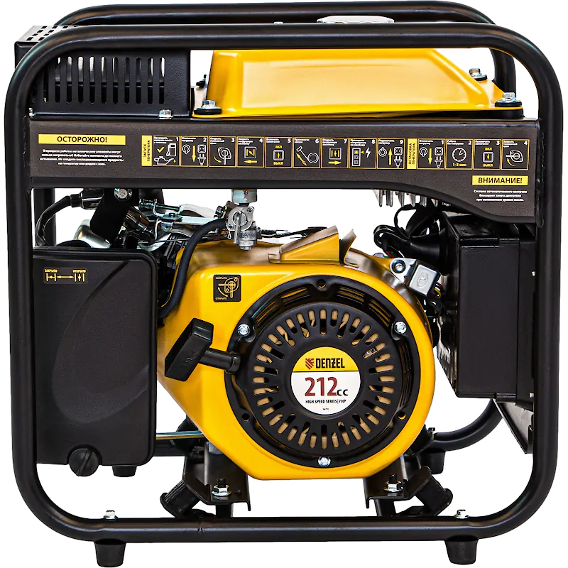 Генератор DENZEL GT-3500iF имеет прочную металлическую раму, которая защищает двигатель и другие внутренние элементы от повреждений при транспортировке и эксплуатации. Открытая конструкция без кожуха облегчает доступ к фильтру, картеру и свече зажигания и улучшает отвод тепла от двигателя.