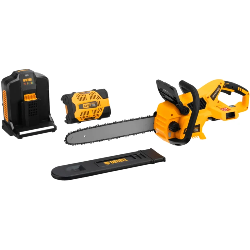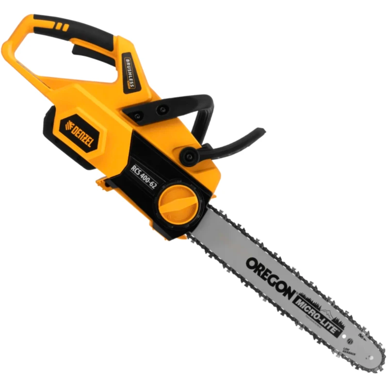 Пила цепная аккумуляторная Denzel RCS 400-62 58620 с шиной длиной 400 мм работает от аккумулятора Li-Ion с рабочим напряжением 62 В. Предназначена для заготовки дров, срезания массивных веток, валки деревьев, распиливания материалов из древесины любых пород. Мощный бесщеточный двигатель обеспечивает скорость вращения шпинделя 10500 об/мин, благодаря чему пила отличается высокой производительностью.