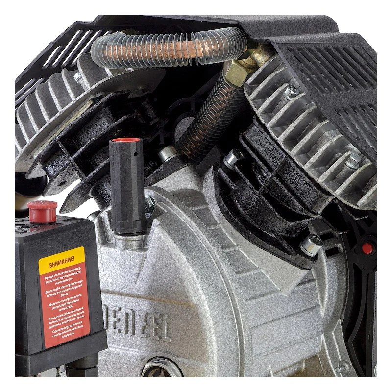 Устройство тепловой защиты останавливает двигатель компрессора DENZEL X-PRO DKV2200/50 при перегреве или перегрузке. Во избежание аварийных ситуаций предохранительный клапан своевременно сбрасывает избыточное давление. Воздушный фильтр с резиновым уплотнителем защищает внутренние узлы от загрязнения. Указатель на картере позволяет контролировать уровень масла.