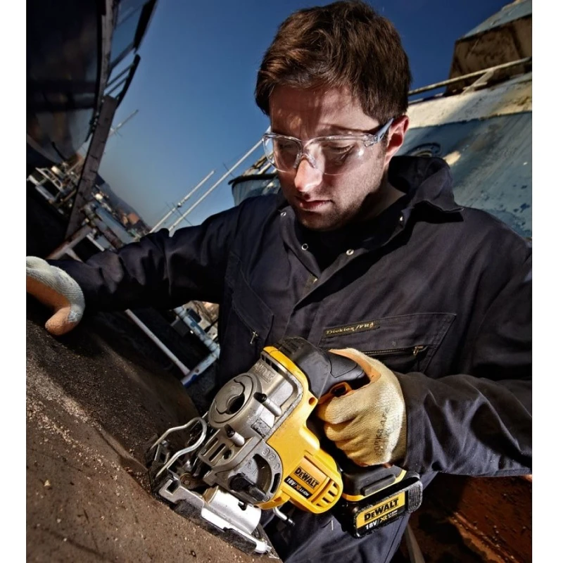 В конструкции аккумуляторного лобзика предусмотрен патрубок для подключения строительного пылесоса или пылесборного мешка. Уборка опилок и пыли в процессе работы важна для здоровья и удобства мастера. Рукоятка лобзика DeWalt DCS331N с нескользящим покрытием из резины обеспечивает уверенный хват. Направляющий ролик находится в нижней части инструмента, что позволяет избежать деформации пильного полотна.