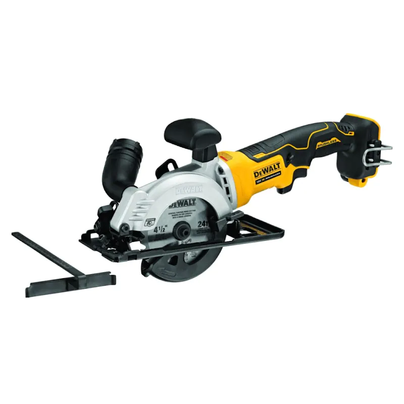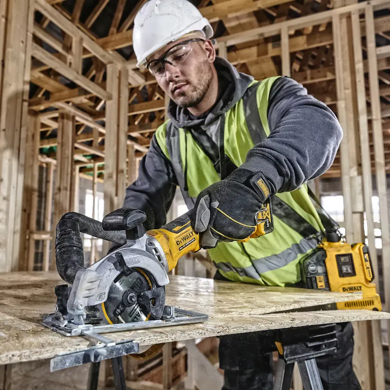 В случае заклинивания диск мгновенно остановится благодаря электронному тормозу. Механизм сдува опилок и система AirLock для подключения пылесоса оставляют линию реза чистой. Левостороннее расположение пильного круга улучшает ее обзор. Для смены диска используется шестигранник. В комплекте с дисковой пилой DeWALT DCS571P2 идет параллельный упор, обеспечивающий высокую точность работы. Боковой крючок упрощает хранение инструмента.