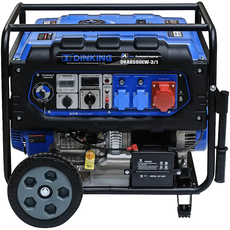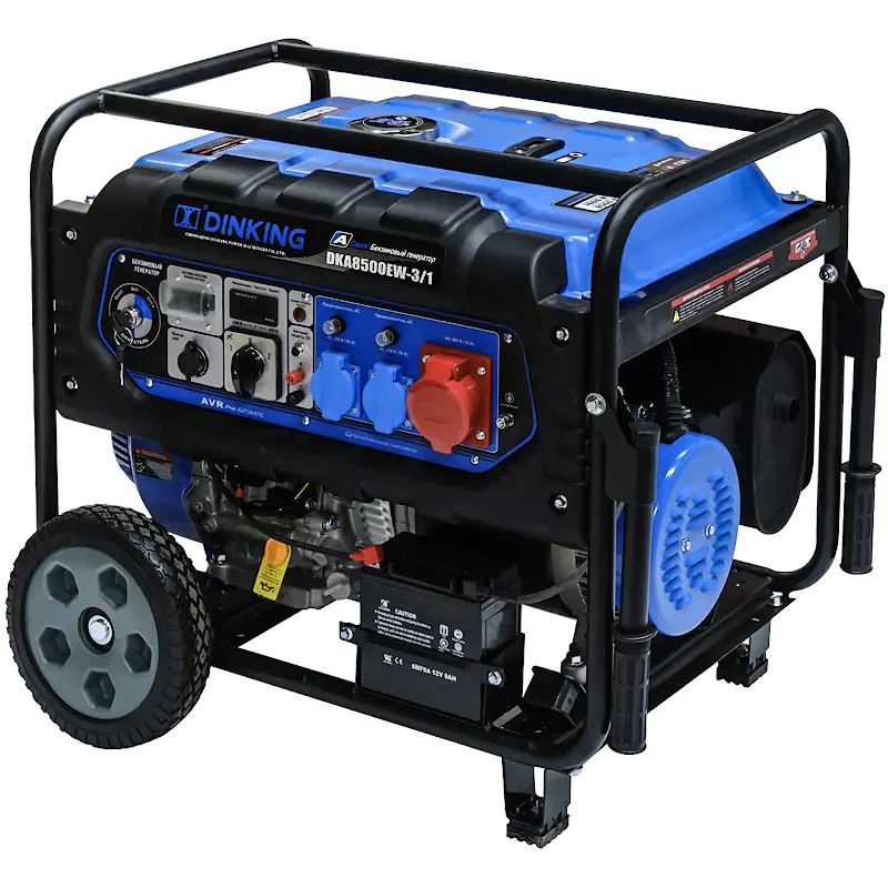 При перегрузке срабатывает автоматическая защита, отключающая нагрузку. Благодаря контролю напряжения AVR мини электростанция вырабатывает ток со стабильными параметрами даже при изменении мощность потребителей. Датчик уровня масла в картере защищает бензиновый генератор от работы на сухую. Индикаторы вовремя сигнализируют о необходимости заправить бензогенератор топливом или маслом. Розетки генератора Dinking DKA8500EW-3/1 закрыты пластиковыми крышками. Демпферные подушки снижают уровень вибрации и шума. Жесткая рамная конструкция обеспечивает устойчивость и быстрый доступ к основным узлам для техобслуживания. Электростанцию с двумя колесами и складными ручками удобно перемещать по рабочей площадке.