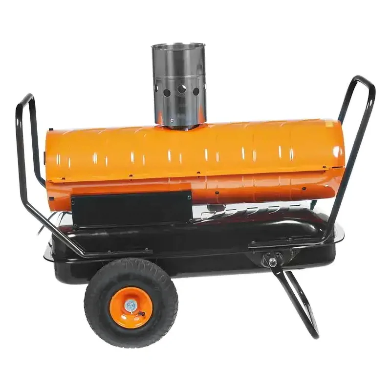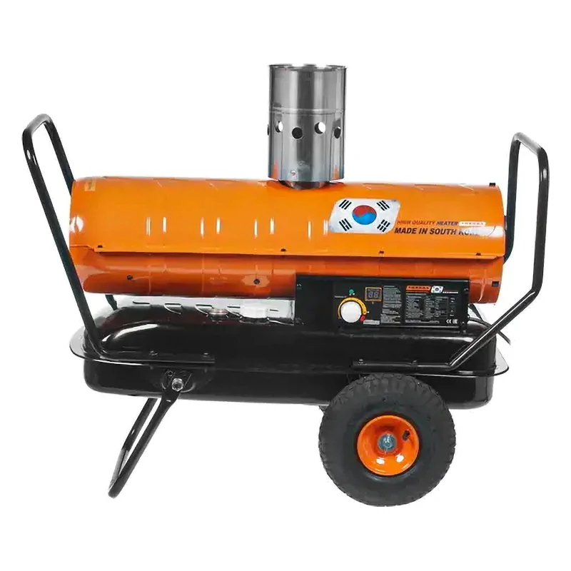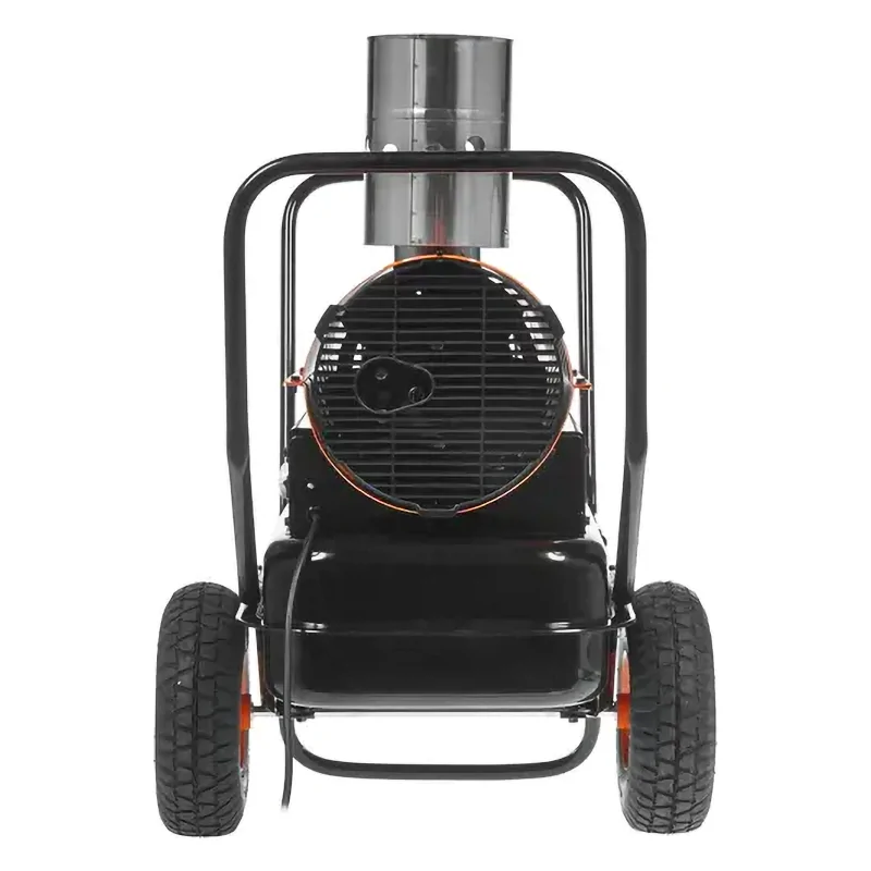 Предусмотрена также защита от перегрева – если температура внутри устройства превысит 80°С, автоматика отключит прибор. Несмотря на значительный вес – 30 кг, пушку легко перемещать за счет больших пневматических колес и удобных рукояток.