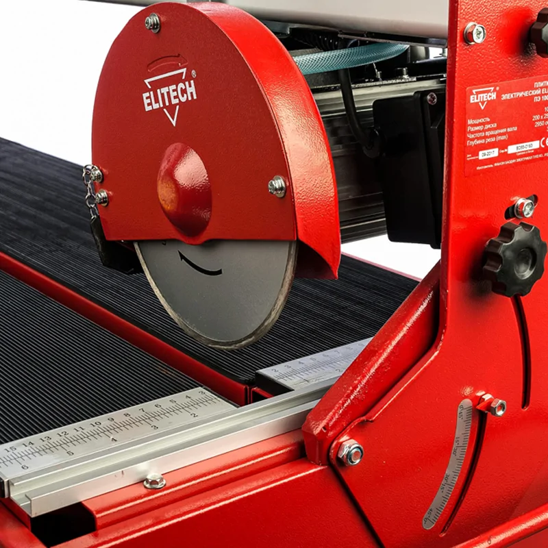 Стол изготовлен из стали, что делает конструкцию прочной. При этом он оснащен резиновым ковриком, который препятствует скольжению заготовки. В конструкции плиткорезного станка ELITECH ПЭ 1000/92Р предусмотрен поддон для воды и насос. Мокрая резка минимизирует количество пыли, которое поднимается в воздух при резке, а также охлаждает алмазный диск, продлевая срок его службы. Всё это также положительно влияет на качество реза, позволяя создавать ровные и точные пропилы.