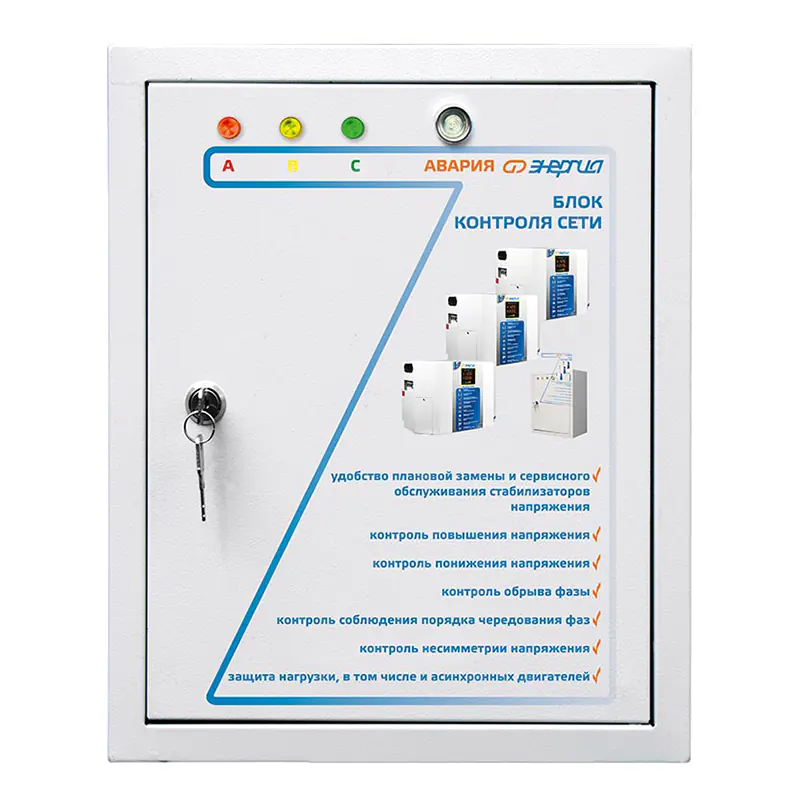 Конструкция состоит из трех стабилизаторов напряжения Voltron (5%) и общего блока контроля фаз (модуль БКС), который позволяет с помощью переключения выбрать трехфазный или однофазный режим работы и обеспечивает высокую степень защиты от аварийных ситуаций как во входной, так и в выходной сети.