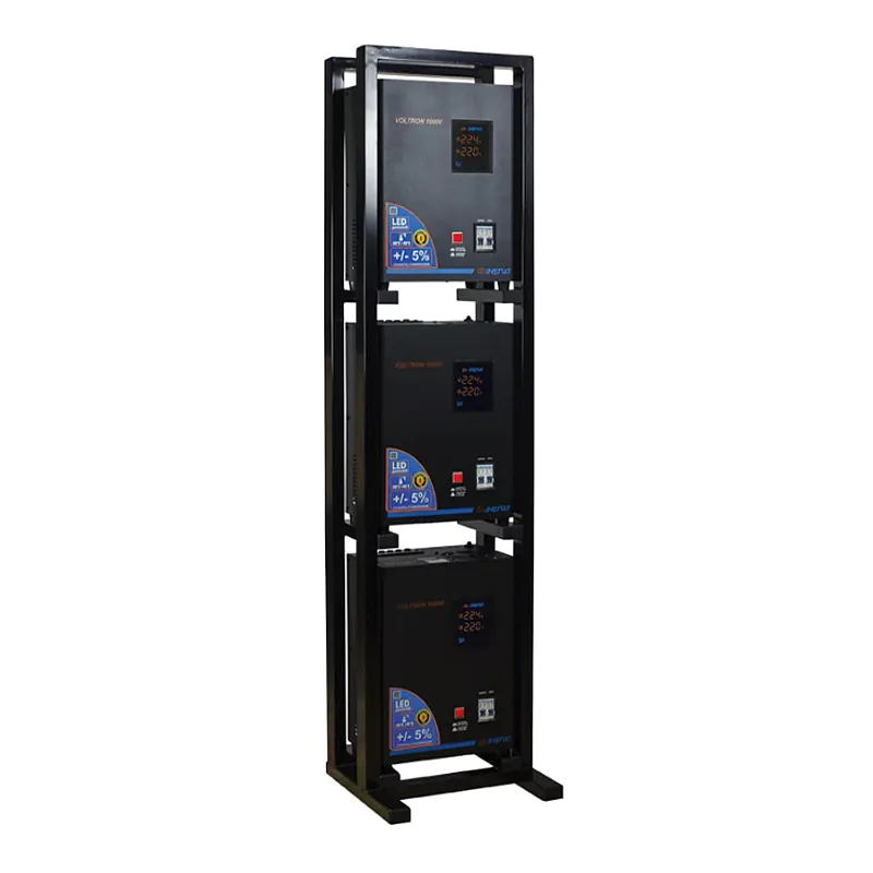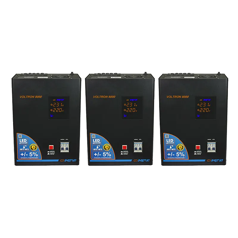 Комплект релейных стабилизаторов напряжения Энергия Voltron (5%) предназначены для обеспечения стабилизированным питанием трехфазных потребителей.